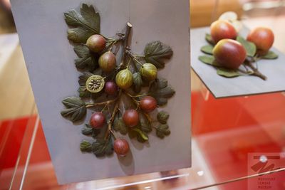 • Dřevěné modely ovoce (jablko: řehtáč soudkovitý, hrušeň: muškatelka turecká a angrešt: vítězná červená) od řezbáře Josefa Rulíška