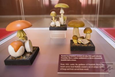 • Dřevěné modely hub (muchomůrka císařka, muchomůrka zelená a kozák dubový), které řezbář Josef Rulíšek vytvářel od roku 1921 pod vedením Františka Skyvy